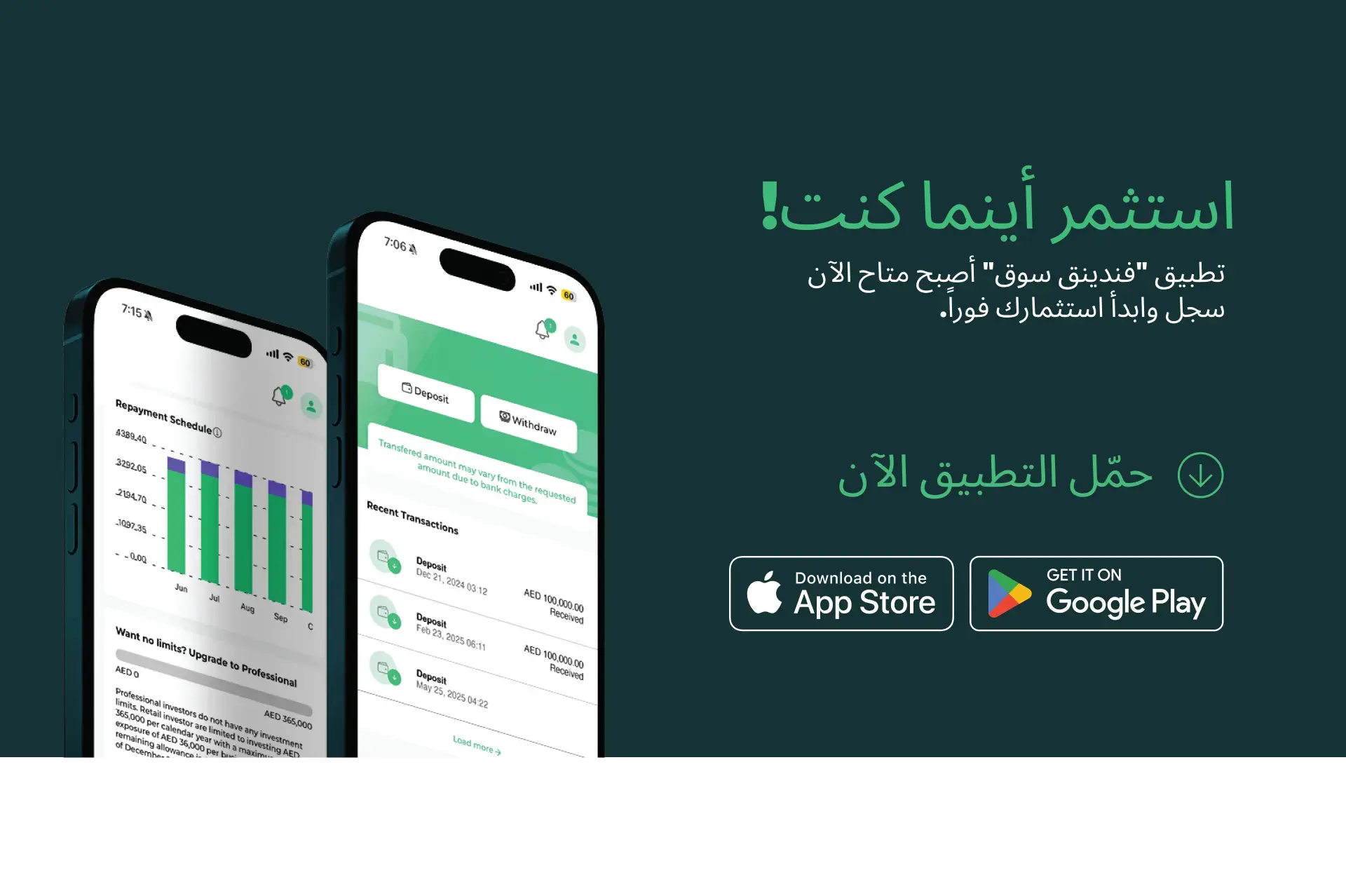 سواء كنت تسعى لتنمية رأس مالك من خلال فرص استثمارية متوافقة مع أحكام الشريعة الإسلامية، أو ترغب فقط بإدارة استثماراتك بسهولة — فإن تطبيقنا الجديد يقدّم لك تجربة "فندينق سوق" الكاملة في راحة يدك.